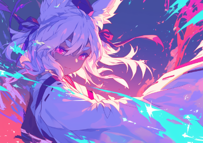 crayon drawing, silent happy, daydream, crystal art, huge stress, stress world, path towards hole, dawn of the cold, curiosity bells skyscraper, killer queen, beautiful cute dark-skinned girl, japanese miko clothes, silk texture, black undershirt, white hair, fox ears, thick eyebrows, sideway glance, imaginary lighting, colorful background, --ar 24:17 --niji 6
