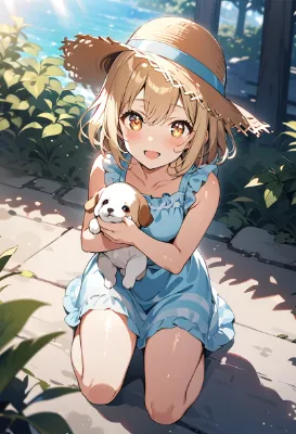 masterpiece, best quality, great, highly detailed CG unity 8k wallpaper, depth of field, (super fine illustration:1.5), illustration, CG, 2D, (Anime Style:1.2), extremely detailed 1 girl, Poster girl, solo, cowboy shot, walking, from side, extremely detailed face, kawaii, happy smile, open mouth, (light pink lips: 0.8), short bob cut hair, (gold hair), (light-orange eyes:1.2), detailed eyes, sparkling eyes, cute face, kawaii, medium breasts, slender body, slender legs, delicate hair, disheveled hair, shiny hair, shiny skin, nice hands, hand on hip, (arms behind back), (Summer dress that shines through in the sunlight:1.2), straw hat, outdoor, daylight, sunflower field, blue sky, light and shadow, (very wide shot), <lora:saturation:0.5> <lora:eyecolle_artemisia_v100:0.7> <lora:yawanuri:1> <lora:flat2:0.3> <lora:hairdetailer:0.7>