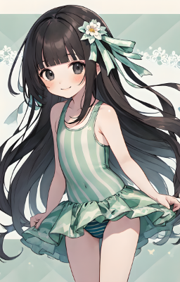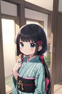 1 girl,(((very longest hair))),black hair, smile,straight Hair,hair ribbon,mintgreen stripe,Black Eyes,flat chest,straight Across bangs,princess Cut, Very Long Sideburn,roundry Head,Droping eyes,cute,Meekness,Bob Cut,long back hair,12 years Old, kimono,pet,Little bird