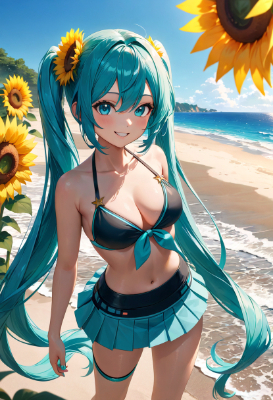 masterpiece, best quality, extremely detailed, anime, girl, skirt((masterpiece)), ((high resolution)), ((best quality)), (ultra-detailed), anime, ((extremely detailed)), 4K, (8K), best quality, dynamic angle, (beautiful), solo, (hatsune miku), outdoors, smile, bikini,mini skirt,blue hair,green hair,blue eyes,twintail,longhair,fantasy,summer,clear sky,sea,starry sky,beach,flower,Sunflower