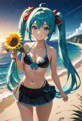 masterpiece, best quality, extremely detailed, anime, girl, skirt((masterpiece)), ((high resolution)), ((best quality)), (ultra-detailed), anime, ((extremely detailed)), 4K, (8K), best quality, dynamic angle, (beautiful), solo, (hatsune miku), outdoors, smile, bikini,mini skirt,blue hair,green hair,blue eyes,twintail,longhair,fantasy,summer,clear sky,sea,starry sky,beach,flower,Sunflower