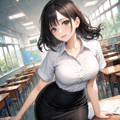 masterpiece, best quality, extremely detailed, BREAK professional illustration, anime, BREAK, 1 female, white skin,brown eyes,(small eyes:1.4),(detailed face:1.3),beautiful female,(realistic:1.5),BREAK,(black hair:1.1),medium hair, flowing hair,flat chest,23 years old,(large breasts:1.2),(smile:0.8), large breasts,BREAK,from below, in front of viewer,(white short sleeves business shirt :1.5),(black stockings:1.1), (black pencil skirt:1.5),She models and (poses sexily:1.2),(She holds an eggplant in her right hand:1.5), soft focus, BREAK, full body long shot,(classroom:1.4),hi res