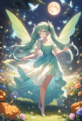 masterpiece, best quality, extremely detailed, anime, girl, skirtIllustration of Hatsunemiku, vocaloid, 1girl, twin tails, long hair, blue hair, green hair, blue eyes, girl fairy. The character has a small body, transparent and delicate feathers, and is wearing a sparkling pastel-colored dress. She dances softly above the flowers, and particles of light are dancing all around her. Her hair spreads softly and softly, and she has a smile on her face. The background is a fantastic landscape with colorful flowers and green grass spreading out in a beautiful forest.,magic,fantasy,nature,Pumpkin,butterfly,night,full moon