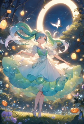 masterpiece, best quality, extremely detailed, anime, girl, skirtIllustration of Hatsunemiku, vocaloid, 1girl, twin tails, long hair, blue hair, green hair, blue eyes, girl fairy. The character has a small body, transparent and delicate feathers, and is wearing a sparkling pastel-colored dress. She dances softly above the flowers, and particles of light are dancing all around her. Her hair spreads softly and softly, and she has a smile on her face. The background is a fantastic landscape with colorful flowers and green grass spreading out in a beautiful forest.,magic,fantasy,nature,Pumpkin,butterfly,night,full moon