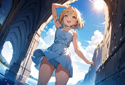masterpiece, best quality, great, highly detailed CG unity 8k wallpaper, depth of field, (super fine illustration:1.5), illustration, CG, 2D, (Anime Style:1.2), extremely detailed 1 girl, Sit on a bench, eat crepes, stuff her mouth with crepe, solo, from side, from above, extremely detailed face, kawaii, happy smile, open mouth, (light pink lips: 0.8), short bob cut hair, (gold hair), (light-orange eyes:1.2), detailed eyes, sparkling eyes, cute face, kawaii, medium breasts, slender body, slender legs, delicate hair, disheveled hair, shiny hair, shiny skin, nice hands, everyday life, blazer, ribbon tie, knee socks, hill park, A place overlooking the city, cityscape, outdoor, Crepe stand, evening, setting sun, light and shadow, (very wide shot), <lora:saturation:0.5> <lora:eyecolle_artemisia_v100:0.7> <lora:yawanuri:1> <lora:flat2:0.3> <lora:hairdetailer:0.7>
