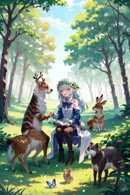 girl,braids,green hair,purple eyes,nature,elf,dancer,original character,colorful,animal,cat,dog,rabbit,steampunk,butterfly,plant,summer,day,blue sky,flower,different world,forest,clear sky(The beautiful elven girl is in the forest, using a tree trunk as a chair and singing and playing music happily with the birds, deer, rabbits, raccoon dogs, deer and bears and other animals. It's so pretty.)