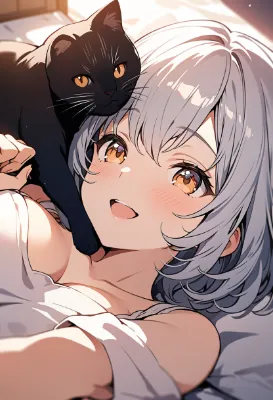 masterpiece, best quality, great, highly detailed CG unity 8k wallpaper, depth of field, (super fine illustration:1.5), illustration, CG, 2D, (Anime Style:1.2), extremely detailed 1 girl with black cat, solo, upper body, lie down on the bed, looking at cat, from above, extremely detailed face, kawaii, happy smile, open mouth, (light pink lips: 0.8), short bob cut hair, (gold hair), (light-orange eyes:1.2), detailed eyes, sparkling eyes, cute face, kawaii, medium breasts, slender body, slender legs, delicate hair, disheveled hair, shiny hair, shiny skin, nice hands, Holding her black cat, black cat, (T-shirt:1.2), indoor, bedroom, (very wide shot), <lora:saturation:0.5> <lora:eyecolle_artemisia_v100:0.7> <lora:yawanuri:1> <lora:flat2:0.3> <lora:hairdetailer:0.7>