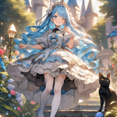 masterpiece, best quality, extremely detailed, anime, girl, skirt,blue hair,blue eyes,princess,light pink color lolita,white stockings,pumps,earrings,Makeup,fantasy,colorful, ,garden,church,smile ,longhair,black cat, <lora:hime_style-1.0r8:1> <lora:noline:1> <lora:sanDka2:1> <lora:hairdetailer:1>