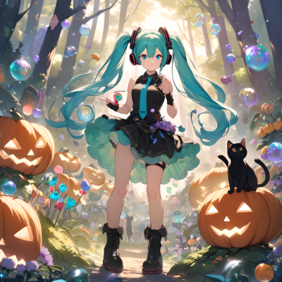 masterpiece, best quality, extremely detailed, anime, girl, skirt,Hatsune Miku, VOCALOID, 1girl, twin tails, long hair, blue hair, green hair, blue eyes, black arm covers, black boots, necktie, sleeveless, , headphones,mini skirt,twintail,longhair,black cat,colorful,fantasy,magic,ry ,lots of sweets,Lollipop,soap bubbles,pumpkin,PastelCalla,flower,fairy,forest,garden
