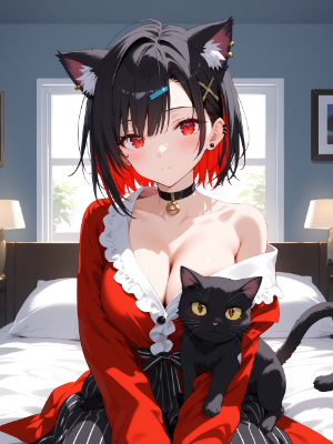 (score_9, score_8_up, score_7_up, score_6_up, score_5_up, score_4_up, source_anime), BREAK,1girl,(glowing eyes:0.5),tall,look at viewer,extremely detailed, anime,masterpiece,8k wallpaper,best quality,detailed face,(perfect quality,beautiful torso,Rich Colors,Brilliant Quality,hughres),BREAK,(shiny skin,shiny hair,pale skin,white skin:1.0),(slender,narrow waist:1.1),(chibi:1.2),(full body, IncrsXLLCM,holding person,beautiful hands,floating body),indoors,dynamic background,(30 years old,adult,tall woman:1.5),BREAK,mole under eye, x hair ornament, fins,red nails,red eyes,sharp eyes,cat eyes,(cat ears:1.2), black hair, short hair,(flipped hair,messy hair:1.2),(red colored inner hair;1.2), hairclip, ear piercing,hair ornament, choker,BREAK,(disgruntled face,closed mouth,embarrassing,blush:1.1),BREAK,(black lingerie dress,long dress),<lora:LongCatMeme_XLPD:1>