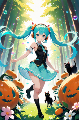 masterpiece, best quality, extremely detailed, anime, girl, skirt,Hatsune Miku, VOCALOID, 1girl, twin tails, long hair, blue hair, green hair, blue eyes, black arm covers, black boots, necktie, sleeveless, , headphones,mini skirt,twintail,longhair,black cat,colorful,fantasy,magic,ry ,lots of sweets,Lollipop,soap bubbles,pumpkin,PastelCalla,flower,fairy,forest,garden,smile, 1girl, twin tails, long hair, blue hair, green hair, blue eyes