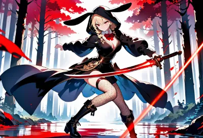 masterpiece, best quality, highly detailed CG unity 8k, depth of field, (super fine illustration:1.5), illustration, CG, 2D, Anime style, complicated, (perfect anatomy), extremely detailed 1 girl, (solo), sword fighting, knight, stylish pose, (full body), looking away, shot from front, walking, extremely detailed face, dignified face, Blood makeup, (kawaii:1.2), detailed eyes, (red eyes:1.2), hairs between eyes, (Two short symmetrical braids:1.2), Braid tied with red ribbon, Blonde hair, delicate hair, shiny hair, (large breasts:1.2), (black robe with gold thread embroidery:1.2), (Rabbit ears black hood up:1.4), long sleeve, black cloak, black bunny, (Wear Fishnet stockings:1.2), Red bow tie, slender body, slender legs, (intricate human hands fingers:1.2), perfect fingers, nice hand, long boots, extremely detailed weapon, extremely detailed red lightsaber, has a red lightsaber, light and shadow, (in the Bloodstained Forest:1.2), Blood pool, Splattered blood stains, (violence:1.2), high quality fantasy art, beautiful digital artwork, exquisite character art, <lora:hairdetailer:0.8> <lora:eyecolle_isotoma_v100:1> <lora:saturation:0.4> <lora:yawanuri:1> <lora:flat2:-0.5>