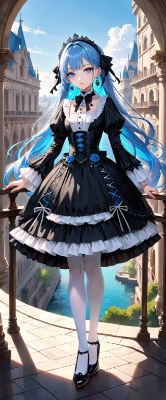 masterpiece, best quality, extremely detailed, anime, girl, skirt,blue hair,blue eyes,princess,light pink color lolita,white stockings,pumps,earrings,longhair,Makeup,fantasy,colorful, ,garden <lora:hime_style-1.0r8:1> <lora:noline:1> <lora:sanDka2:1> <lora:hairdetailer:1>