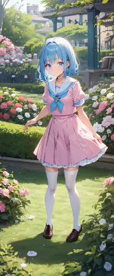 masterpiece, best quality, extremely detailed, anime, girl, skirt,blue hair,blue eyes,princess,dress,maid,light pink color waitress uniform,white stockings,pumps,gradation,bobcut,Makeup,different world,garden <lora:noline:1> <lora:hairdetailer:1> <lora:hime_style-1.0r8:1> <lora:sanDka2:1>