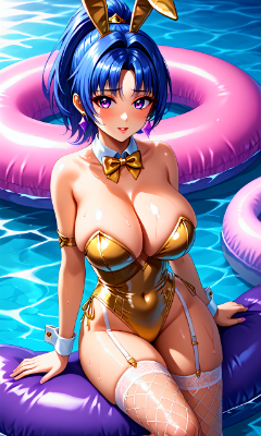 ultra detailed, masterpiece, best quality, perfect lighting, beautiful face, beautiful eyes, cute eyes, shiny hair, 1girl, voluptuous body, large breasts, wet body, AilishDG, light blue hair, ponytail, purple eyes, earrings, <lora:Aiilish PonyXL V1:0.7>, purple playboy bunny suit, high leg cut, white collar, purple bow tie, white cuffs, garter straps, fishnet thigh highs, golden thigh highs, black high heel, bunny tail, shy, pool side, float floating in water, resort area