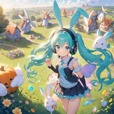 masterpiece, best quality, extremely detailed, anime, girl, skirtmasterpiece, best quality, extremely detailed, anime, girl, skirt, Hatsune Miku, vocaloid, 1 girl, twin tails, long hair, blue hair, green hair, blue eyes, black arm covers, black boots, necktie, sleepwear, headphones, mini skirt, twintail, longhair, , colorful, fantasy, magic, ry, lots of sweets, lollipop, soap bubbles, pumpkin, pastelcalla, flower, fairy, , , smile Illustration of 1girl, twin tails, long hair, blue hair, green hair, blue eyes, girl fairy. The character has a small body, transparent and delicate feathers, and is wearing a sling pastel-colored dress. She dances softly above the flowers, and particles of light are dancing all around her. Her hair spreads softly and softly, and she has a smile on her face. The background is a fantastic landscape with colorful flowers and green grass spreading out in a beautiful .,bunny,day,Colorfulmushroom,windmill village,grassland,rabbit,Windmill