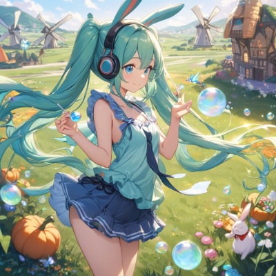 masterpiece, best quality, extremely detailed, anime, girl, skirtmasterpiece, best quality, extremely detailed, anime, girl, skirt, Hatsune Miku, vocaloid, 1 girl, twin tails, long hair, blue hair, green hair, blue eyes, black arm covers, black boots, necktie, sleepwear, headphones, mini skirt, twintail, longhair, , colorful, fantasy, magic, ry, lots of sweets, lollipop, soap bubbles, pumpkin, pastelcalla, flower, fairy, , , smile Illustration of 1girl, twin tails, long hair, blue hair, green hair, blue eyes, girl fairy. The character has a small body, transparent and delicate feathers, and is wearing a sling pastel-colored dress. She dances softly above the flowers, and particles of light are dancing all around her. Her hair spreads softly and softly, and she has a smile on her face. The background is a fantastic landscape with colorful flowers and green grass spreading out in a beautiful .,bunny,day,Colorfulmushroom,windmill village,grassland,rabbit,Windmill