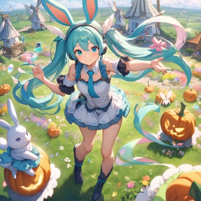 masterpiece, best quality, extremely detailed, anime, girl, skirtmasterpiece, best quality, extremely detailed, anime, girl, skirt, Hatsune Miku, vocaloid, 1 girl, twin tails, long hair, blue hair, green hair, blue eyes, black arm covers, black boots, necktie, sleepwear, headphones, mini skirt, twintail, longhair, , colorful, fantasy, magic, ry, lots of sweets, lollipop, soap bubbles, pumpkin, pastelcalla, flower, fairy, , , smile Illustration of 1girl, twin tails, long hair, blue hair, green hair, blue eyes, girl fairy. The character has a small body, transparent and delicate feathers, and is wearing a sling pastel-colored dress. She dances softly above the flowers, and particles of light are dancing all around her. Her hair spreads softly and softly, and she has a smile on her face. The background is a fantastic landscape with colorful flowers and green grass spreading out in a beautiful .,day,Colorfulmushroom,windmill village,grassland,rabbit,Windmill
