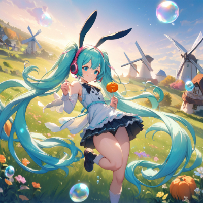 masterpiece, best quality, extremely detailed, anime, girl, skirtmasterpiece, best quality, extremely detailed, anime, girl, skirt, Hatsune Miku, vocaloid, 1 girl, twin tails, long hair, blue hair, green hair, blue eyes, black arm covers, black boots, necktie, sleepwear, headphones, mini skirt, twintail, longhair, , colorful, fantasy, magic, ry, lots of sweets, lollipop, soap bubbles, pumpkin, pastelcalla, flower, fairy, , , smile Illustration of 1girl, twin tails, long hair, blue hair, green hair, blue eyes, girl fairy. The character has a small body, transparent and delicate feathers, and is wearing a sling pastel-colored dress. She dances softly above the flowers, and particles of light are dancing all around her. Her hair spreads softly and softly, and she has a smile on her face. The background is a fantastic landscape with colorful flowers and green grass spreading out in a beautiful .,day,Colorfulmushroom,windmill village,grassland,rabbit,Windmill