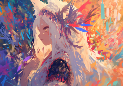 crayon drawing, silent happy, daydream, crystal art, huge stress, stress world, path towards hole, dawn of the cold, curiosity bells yahhhooo, killer queen, beautiful cute dark-skinned girl, japanese miko clothes, silk texture, black undershirt, white hair, fox ears, thick eyebrows, sideway glance, imaginary lighting, colorful background, --ar 24:17 --niji 6