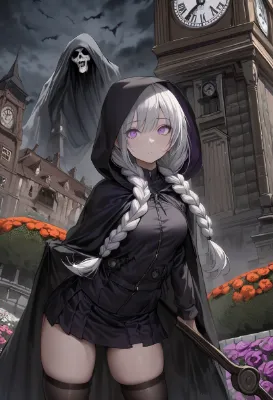 masterpiece,best quality,extremely detailed,modern,town,Small clock tower,flowerbed,In front of the clock tower,1girl,braids,mini skirt,zettai ryouiki,Sensual body,Hooded cloak,grim reaper,silver hair,purple eyes,Scythe in the left hand <lora:hyperdetailer_v060.safetensors:1> <lora:saturation:1>