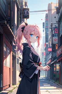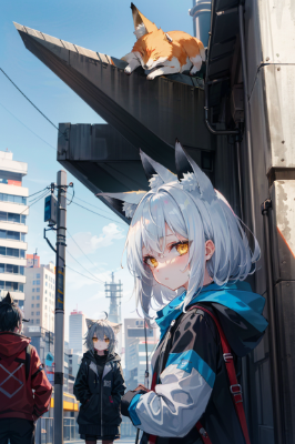 girl,,black hair,red eyes,meeting,fox girl,original character,fantasy,cyberpunk,summer,day,blue sky,park,city,clear sky (The fox girl is meeting her friend at the station and seems to be still staring blankly at the sight.) <lora:hime_style-1.0r8:1>