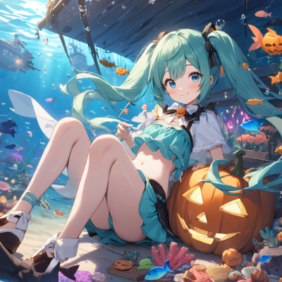masterpiece, best quality, extremely detailed, anime, girl, Hatsune Miku, VOCALOID, bikini swimsuit, 1girl, twin tails, long hair, blue hair, green hair, blue eyes, underwater, coral reef, colorful fish, sunken ship,Pumpkin,Lollipop,Halloween,PastelCalla,chocomintCalla,clear water,mini ,mini ,mini skirt,meeting,fairy,fantasy,magic,sea,smile