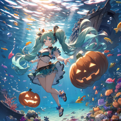 masterpiece, best quality, extremely detailed, anime, girl, Hatsune Miku, VOCALOID, bikini swimsuit, 1girl, twin tails, long hair, blue hair, green hair, blue eyes, underwater, coral reef, colorful fish, sunken ship,Pumpkin,Lollipop,Halloween,PastelCalla,chocomintCalla,clear water,mini ,mini ,mini skirt,meeting,fairy,fantasy,magic,sea,smile