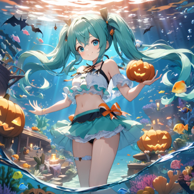 masterpiece, best quality, extremely detailed, anime, girl, Hatsune Miku, VOCALOID, bikini swimsuit, 1girl, twin tails, long hair, blue hair, green hair, blue eyes, underwater, coral reef, colorful fish, sunken ship,Lollipop,PastelCalla,chocomintCalla,clear water,mini ,mini ,meeting,fairy,fantasy,magic,sea,smile