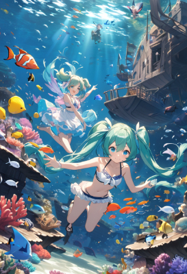 masterpiece, best quality, extremely detailed, anime, girl, Hatsune Miku, VOCALOID, bikini swimsuit, 1girl, twin tails, long hair, blue hair, green hair, blue eyes, underwater, coral reef, colorful fish, sunken ship,Lollipop,PastelCalla,chocomintCalla,clear water,mini ,mini ,meeting,fairy,fantasy,magic,sea,smile
