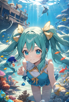 masterpiece, best quality, extremely detailed, anime, girl, Hatsune Miku,VOCALOID, 1girl, twin tails, long hair, blue hair, green hair, blue eyes, underwater, coral reef, colorful fish, sunken ship,Lollipop,PastelCalla,chocomintCalla,clear water,mini ,mini ,meeting,fairy,fantasy,magic,sea,smile