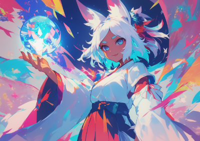 crayon drawing, silent happy, daydream, crystal art, huge stress, stress world, path towards hole, dawn of the cold, curiosity bells yahhhooo, killer queen, beautiful cute dark-skinned girl, japanese miko clothes, silk texture, black undershirt, white hair, fox ears, thick eyebrows, sideway glance, imaginary lighting, colorful background,
