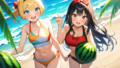 2girls, anime style, beach setting, short blonde hair, blue eyes, hair bow, red bow, long black hair, hair ornament, hairband, black eyes, watermelon splitting, blindfold, pointing, shouting encouragement, masterpiece, best quality, very aesthetic, absurdres, best quality, amazing quality, very aesthetic, absurdres