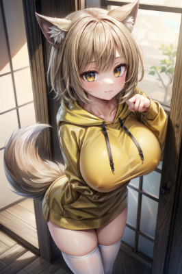 (best quarity:1.5), high resolution, (extremely detailed), ultra high res, 8K, masterpiece, (perfect anatomy), (1 girl), 20 years old, huge breast, adult, sexy, (shiny blonde hair, wolf cut, wolf ears on head), (beige hoodie, unzipped, breast press:1.4), (standing, leaning on transparent door, on forward), (sheer black pantyhose, :3, claw pose), blush, store, indoor, portrait, from above, front view, white skin, (super fine illustration, photorealistic, depth of field), <lora:hairdetailer:0.8>