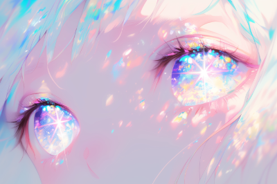 masterpiece, best quality, ultra-detailed, illustration, 1girl, anime, clear coloring, close-up of the face, eyes forward, white eyes, opal-like eyes that shimmer with iridescent hues of pink and blue and green reflecting light like a precious gem, pastel tones and a dreamlike atmosphere, accentuating the mystical quality of her gemstone-like eyes --ar 3:2 --niji 6