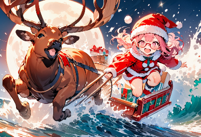 masterpiece, best quality, extremely detailed, absurdres, highres, 8K, ultra detailed, watercolor, a girl and a Reindeer, 8yo, (red rim glasses:1.2), pink hair and pink eyes, Santa Claus costume, laughing with mouth wide open, Australian coast, one knee, Reindeer sleigh surfing on a big wave, splashing waves, full moon night