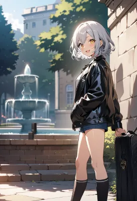 masterpiece, best quality, great, highly detailed CG unity 8k wallpaper, depth of field, (super fine illustration:1.5), illustration, CG, 2D, (Anime Style:1.2), extremely detailed 1 girl, solo, upper body, arched back, standing, from side, (from below), looking up, extremely detailed face, kawaii, happy smile, open mouth, (light pink lips: 0.8), short bob cut hair, (gold hair), (light-orange eyes:1.2), detailed eyes, sparkling eyes, cute face, kawaii, medium breasts, slender body, slender legs, delicate hair, disheveled hair, shiny hair, shiny skin, nice hands, hand on hip, arm up, salute, red bikini, choker with bell, santa hat, outdoor, daylight, Backlit, blue sky, beach, (summer christmas:1.2), (christmas tree:1.2), present bag, light and shadow, (very wide shot), wet, <lora:hohoaka:0.7> <lora:saturation:0.55> <lora:eyecolle_artemisia_v100:0.7> <lora:yawanuri:1> <lora:flat2:0.3>