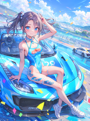 レース前の撮影会でレースカーの上に座ってポーズをとるセクシーなレースクイーンの女の子を作ってみました。