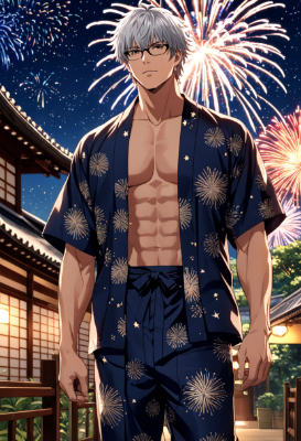 masterpiece, best quality, extremely detailed, anime , 1adult woman, solo, pantyhose, skirt, braid, necktie, brown hair, green flower pattern yukata, geta, smile, single lower braid, scrunchie, breast, closed mouth, smile, press hands in prayer, night, fireworks, starry sky, <lora:eyecolle_dianthus_v100:1>