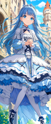masterpiece, best quality, extremely detailed, anime, girl, skirt,blue hair,blue eyes,princess,light blue color gothic lolita,white stockings,pumps,earrings, ,colorful,different world,longhair <lora:hime_style-1.0r8:1> <lora:noline:1> <lora:sanDka2:1> <lora:hairdetailer:1>,beautiful eyes,my child,castle,balcony