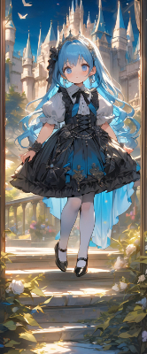 masterpiece, best quality, extremely detailed, anime, girl, skirt,blue hair,blue eyes,princess,light blue color gothic lolita,white stockings,pumps,earrings, ,colorful,different world,longhair <lora:hime_style-1.0r8:1> <lora:noline:1> <lora:sanDka2:1> <lora:hairdetailer:1>,beautiful eyes,my child,castle,balcony