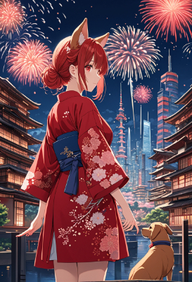 masterpiece, best quality, extremely detailed, anime, 1girl, Solo, dog ears, blonde hair, heterochromia, gold eyes, red eyes, white yukata, dog footprint pattern, night, fireworks, geta, future city,