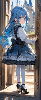 masterpiece, best quality, extremely detailed, anime, girl, skirt,blue hair,blue eyes,princess,light blue color gothic lolita,white stockings,pumps,earrings, ,colorful, <lora:hime_style-1.0r8:1> <lora:noline:1> <lora:sanDka2:1> <lora:hairdetailer:1>,beautiful eyes,my child,castle,balcony,wink,bobcut