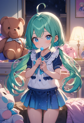 masterpiece, best quality, extremely detailed, anime, girl, skirt,hatsunemiku,vocaloid,blue eyes,twintail,longhair,mini skirt,my child,beautiful eyes,colorful,starry sky,night,ahoge,PastelCalla,Teddy bear,bubbles,Lollipop,bedroom,blue hair,green hair