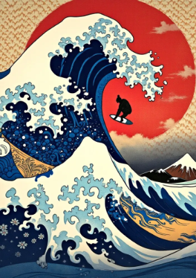 Japanese ink painting, playful art, Satire and jokes work, (ukiyo-e style) mixing new new interpretation of Japanimation, dynamic painting, dynamic brushwork, wide shot, Mt.Fuji and big wave, (a kabuki-surfer riding on top of a huge wave), Eccentric Japanese pattern background