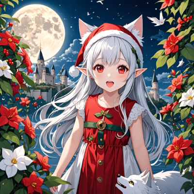 8K,(((masterpiece,best quality,Ultra extremely detailed,perfect anatomy,detailed))),((close-up from_above:1.5, child elf standing)),(plant_pattern,black_santa_cap,see-through Gorgeous_Cloth_dress),wolf_cat white hair,(looking at viewer),(opening mouth:1.5),((opened eyes wide)),smile,blush,lipstick,full fresh lips,big hip,((Eye Reflections, reflect red highlight eyes, detailed_red_eyes,one beautiful detailed child_elf:1.5)),solo,child_elf:2,(wolf_cut_hair:1.5),((great shining skin)),hairband,(white_cut_cut_hair),wave shining white hair,((shining wet skin)),BREAK,summer christmas,moon,many flowers,cloud,fortress_in_distance,birds,<lora:hairdetailer:1> <lora:make25d_type1_v100:1>,,