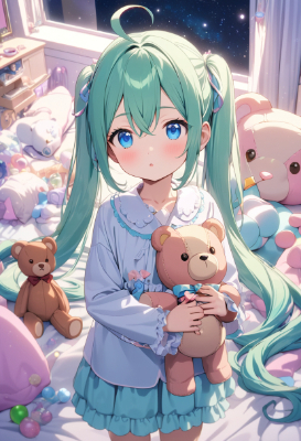 masterpiece, best quality, extremely detailed, anime, girl, ,hatsunemiku,vocaloid,blue eyes,twintail,longhair,my child,beautiful eyes,colorful,starry sky,night,ahoge,PastelCalla,Teddy bear,bubbles,Lollipop,blue hair,green hair,soundly,PastelCalla,pajamas,dream,skirt,flower,forest,full moon,magic