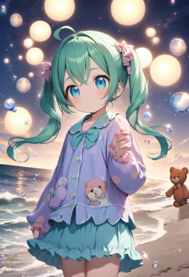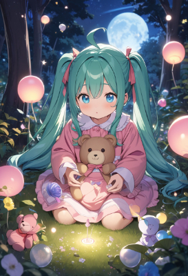masterpiece, best quality, extremely detailed, anime, girl, ,hatsunemiku,vocaloid,blue eyes,twintail,longhair,my child,beautiful eyes,colorful,starry sky,night,ahoge,PastelCalla,Teddy bear,bubbles,Lollipop,blue hair,green hair,PastelCalla,pajamas,dream,skirt,flower,full moon,magic,sea,beach