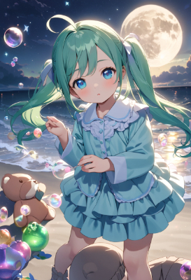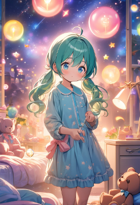 masterpiece, best quality, extremely detailed, anime, girl, ,hatsunemiku,vocaloid,blue eyes,twintail,longhair,colorful,starry ,night,ahoge,PastelCalla,Teddy bear,bubbles,Lollipop,blue hair,green hair,PastelCalla,pajamas,dream,skirt,flower,soundly,my child,bedroom,magic,starry sky