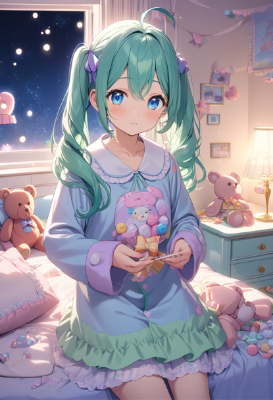 masterpiece, best quality, extremely detailed, anime, girl, ,hatsunemiku,vocaloid,blue eyes,twintail,longhair,colorful,starry ,night,ahoge,PastelCalla,Teddy bear,bubbles,Lollipop,blue hair,green hair,PastelCalla,pajamas,dream,skirt,flower,soundly,my child,bedroom,starry sky,wink